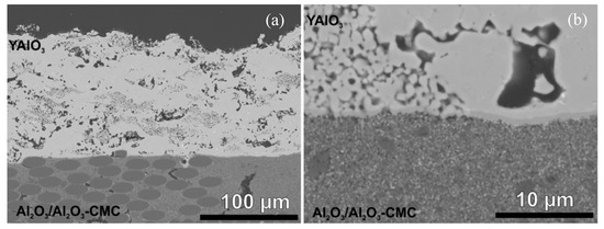 The suitability of YAlO3 coatings as EBC for an Al2O3/Al2O3–CMC was examined. YAlO3 coatings were produced by means of APS and VLPPS, without applying any bond coats. Furthermore, no surface pretreatment was carried out. The APS YAlO3 coating trials resulted in coatings with either poor crystallinity or large pores, both of which are not favorable for an EBC.