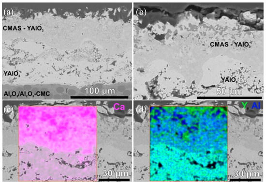 SEM images of the VLPPS YAlO3 coatings after 274 cycles in the CMAS test rig (a,b). EDS mappings for Ca (c) and Y and Al (d).