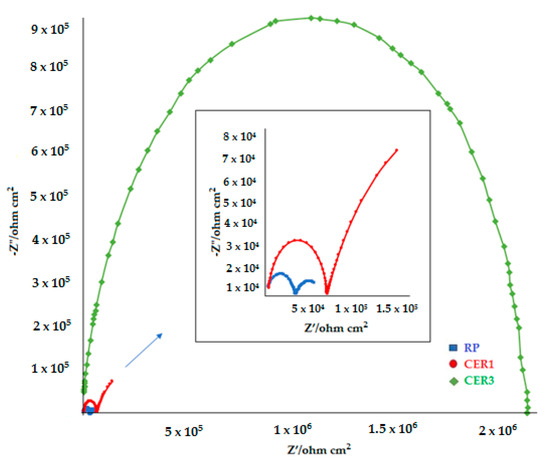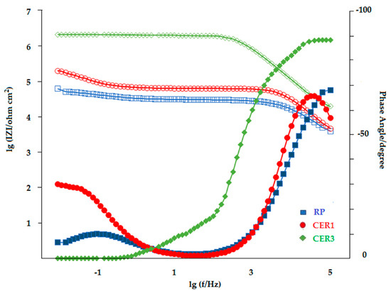 | Sample | Q1 (Q2), F cm−2 | n1 | R2, Ω cm2 | Q3, F cm−2 | n2 | R3, Ω cm2 | |Z| at 0.01 Hz (Ω cm2, log10) |