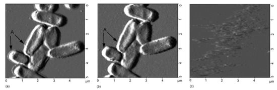 AFM images of E. coli cells on the TiO2 film: (a) no illumination; (b) illumination for 1 day; (c) illumination for 6 days. Light intensity was 1.0 mW/cm2. Adapted with permission from [106]; Copyright 2003 Elsevier Science B.V.