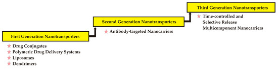 The most used NPs in oncology field are protein-drug conjugated, liposomal, polymeric and dendrimeric nanoparticles, hydrogels, carbon nanotubes, and gold and silver nanoparticles. In the last 30 years, extensive studies have focused on developing cancer nanosized pharmaceutical forms that are capable of overcoming the biological barriers and that can effectively transport the active principles to the targeted sites, with minimal harmful effects in healthy tissues [15]. Over time, several types of nanotransporters have been created, as it can be observed in the Figure 2.