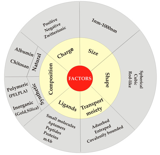 Many factors can influence nanoparticle’s drug delivery, such as sizes, shape, surface chemistry, reactivity, encapsulation capacity, transport mechanisms, ability to escape the clearance systems [20]. They are outlined in the Figure 3.