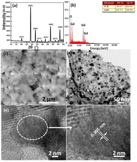 Typical (a) XRD pattern, (b) EDS spectrum, (c) SEM image, (d) TEM image, and (e,f) HRTEM images of Gd2O3 nanoparticles.