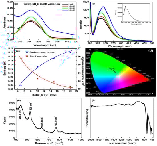 With increase in the concentration from 5 to 20 mM, there has an increment in the absorbance of around 63%. The change in the peak position was not so prominent with the concentration of the salt. On the other hand, a fluorescence emission peak was observed at 336 nm with λexc = 290 nm (Figure 2b). This peak has been associated with the emission from 6P7/2↔8S7/2 in Gd(III) ions [35]. The enhancement in the concentration of the starting material has produced an increment of 50.7% in intensity value, whereas the peak position has only shown a change of 10 nm. This variation has displayed the similarity with UV-vis studies. The PL spectra of as-synthesized nanoparticles has shown the characteristic peaks at 390 nm and a broad peak between 400–500 nm with a center at 417 nm (λexc = 350 nm) (inset Figure 2b). The sharp peak at 390 nm has been associated with the radiative recombination of holes with electrons present at the oxygen vacant positions formed due to the photogeneration effect. The other peak was associated with the self-trapped exciton luminescence in formed particles [36]. The optical band-gap values (Eg) and agglomeration number for Gd2O3 nanoparticles (Figure 2c) have been estimated by using the application of the Brus method [37]. The results have clearly explained the behavioral variation of band-gap value with the concentration of GdCl3·6H2O salt during the synthesis. The decrease in the value of the band gap with the concentration has been associated with the variation of size of the formed particles with the concentration of the starting material. The particle size was comparatively higher for the nanoparticles prepared with 25 mM GdCl3·6H2O salt. These variations of starting material have directly influenced the size of the particles, and the respective agglomeration number of the particles has also varied in a similar manner. Figure 2d has displayed the respective assignment of their colors in the Commission Internationale de L’Eclairage (CIE) diagram for the Gd2O3 nanoparticles. The respective value of CIE chromaticity coordinates is found to be x = 0.3265, y = 0.4462, respectively. The outcomes have been associated with the green-shift effect in the formed particles. The formed particles have been further characterized by using the Raman and FTIR spectra of Gd2O3 nanoparticles (Figure 2e,f). On interpretation, Gd2O3 nanoparticles displayed four major Raman peaks at 444.1, 528, 637.8 and 767.4 cm−1, respectively (Figure 2e). These peaks are mainly associated with the Fg and Ag mode for cubic C-type Gd2O3 particles [38]. Moreover, other Raman active modes such as 4Ag, 4Eg, and 14Fg have also contributed toward the peaks in the spectra [39,40]. A sharp IR peak has been detected below 500 cm−1, which has been attributed to Gd–O [40]. The small peak at 1500 cm−1 has been associated with the δ(O–H) vibrations due to the water bound to the nanoparticles surface in the form of moisture [41,42,43,44].