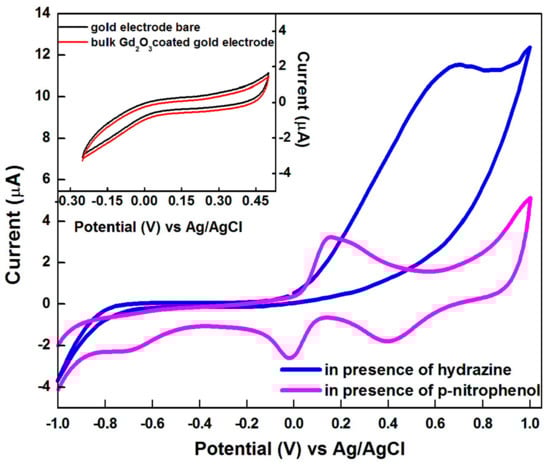 From Figure 3, it was found that there has been no signal in the reverse sweep for hydrazine samples. The results have confirmed the irreversible nature of the oxidation process for hydrazine. On other hand, the samples of p-nitrophenol have displayed the redox peaks in both forward and backward directions, which make the analysis of p-nitrophenol reversible in nature [45]. In the presence of Gd2O3 nanoparticles, there has been found a significant increase in the peak current for respective analytes. This has clearly verified the utilities of formed nanoparticles for electro-analytical purposes. The enhancement of peak current has been mainly explained by the enhancement of conductivity of the electrode due to the functionalization of the gold electrode surface with Gd2O3 nanoparticles. These results have further validated that the formed Gd2O3 nanoparticles are capable as efficient electron transporters for the electrocatalysis of harmful pollutants.