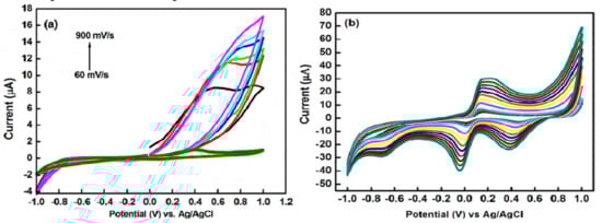 The scan rate variations have also been carried out in order to investigate the electron transfer mechanism for a Gd2O3 modified gold electrode in the presence of hydrazine and p-nitrophenol. Figure 4a,b shows the typical voltammograms for a Gd2O3 nanoparticles-coated gold electrode with 1 mM solution of respective analyte (i.e., hydrazine and p-nitrophenol) in 0.1 M PBS solution with pH = 7.0 at different scan rates. The spectrum has revealed a regular enhancement of current response with varying the scan rate from 60 to 900 mV/S for both the analytes. The higher surface area of Gd2O3 nanoparticles has played a critical role for the improved electron transfer process for the catalytic performance toward the understudied analytes. The enhancement of peak current with the scan rate has clearly pointed out the electrocatalytic reaction of hydrazine and p-nitrophenol at the surface of the modified electrode. These current variations have been mainly explained by the surface adsorption to diffusion processes at a façade of modified electrodes [45].