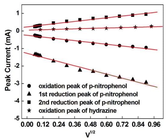 The linear dependence of peak current versus square root of scan rate for 1 mM hydrazine and p-nitrophenol.
