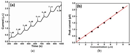 (a) Amperometric response of the Gd2O3/Au electrode with an increase in the concentration of hydrazine and (b) respective peak current vs. concentration plot of hydrazine in PBS at pH = 7.