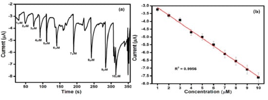 (a) Amperometric response of the Gd2O3/Au electrode with an increase in the concentration of p-nitrophenol and (b) respective peak current vs. concentration plot of p-nitrophenol in PBS at pH = 7.