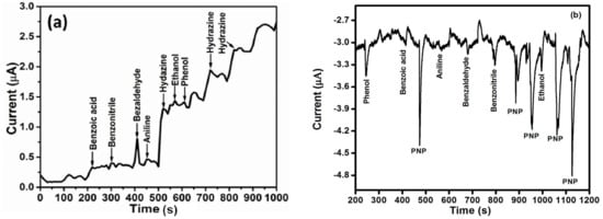 In order to apply the proposed sensor for the determination of p-nitrophenol and hydrazine in an aqueous system, the respective selectivity of the sensor has been investigated in the presence of 1 mM of various interfering compounds (benzaldehyde, benzoic acid, benzonitrile, phenol, ethanol, and aniline) at a fixed potential 0.67 V for hydrazine and −0.69 for PNP. Figure 8 has displayed the amperometric response of a Gd2O3/BCA/Au electrode for the same. From the data, it has been found that a negligible change to response current has been detected in the presence of different interfering compounds. However, significant and quick responses were observed in the presence of hydrazine and PNP. These outcomes have clearly explained the high selectivity of the fabricated sensor toward hydrazine and PNP, and enhanced the scope of the developed sensor.