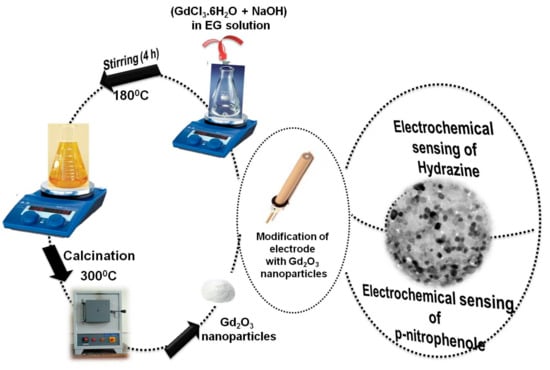 In summary, the current work has reported the fabrication of the ethylene glycol-mediated synthesis of Gd2O3 Nps. The formation of the particles has been scrutinized by using sophisticated characterization techniques. The effects of synthetic parameters over the optical, photoluminescence, band-gap variation, and agglomeration number of the formed particles have been studied in detail. The fabricated particles have further been employed as a proficient electrocatalytic material for the enzyme-free detection of hydrazine and p-nitrophenol with great sensitivity and selectivity. The developed sensors hold a wider linear range of 1 to 10 µM with low detection limits of 1.527 µM and 0.704 µM for p-nitrophenol and hydrazine, respectively. The sensitivity, selectivity, repeatability, recyclability, wide linear range, and detection limit make Gd2O3 Nps a favorable nanomaterial in the institution of the rapid and effectual scrutiny of harmful environmental pollutants. The realistic application of the developed sensor has also been investigated by spiking known concentrations of hydrazine and p-nitrophenol in different water samples with good recoveries. Consequently, the successful synthesis of EG@Gd2O3 nanoparticles has immense potential for the design of highly effective electrochemical sensors, and is a probable way to provide momentum to the advancement of new electrode materials.