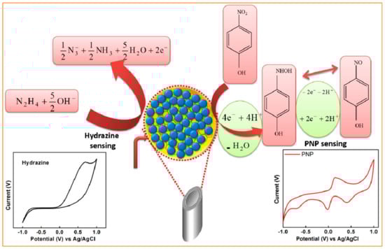 Aromatic nitro as well as hydrazine are some of the few compounds that are frequently used in the preparation of insecticides, pesticides, pharmaceuticals, and in chemical industries [1,2,3]. The highly stable nature and lower degradation efficiency of these compounds imparted serious health hazards to human health [4,5]. The utilities of these chemicals in the preparation of explosives are well established in the literature [6]. For instance, according to the U.S Homeland Security Information Bulletin, hydrazine was used in a terrorist attack in 2003 [7]. Hence, from the perspective of safety and security, the development of simple, handy, and competent methodology to monitor these contaminants is the crucial need of the society [8]. To date, there have been a number of analytical instrumental techniques—such as colorimetric, X-ray, fluorescence emission spectroscopy, inductively coupled plasma spectroscopy, atomic absorption spectroscopy, mass spectroscopy, and chromatography—that have been employed for the detection of p-nitrophenol as well as hydrazine [9,10,11,12].