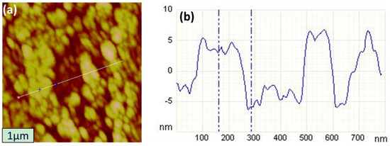 To determine the thickness difference between region A and region B of NiO thin films, AFM measurements were performed. Figure 3a shows an AFM surface image (1 × 1 μm2 scan area) of an N-doped NiO thin film at room temperature. Figure 3b illustrates the thickness variation along the line in Figure 3a. According to Figure 3b, region A was 9 nm thicker than region B, on average.