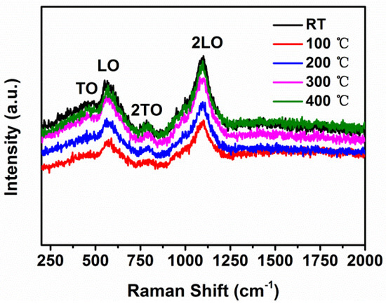 The room-temperature Raman scattering spectra of NiO thin films at different substrate temperatures are shown in Figure 5. Four peaks were observed. Raman peaks located at about 458 and 599 cm−1 corresponded to the transverse optical (TO) and longitudinal optical (LO) phonon modes of NiO, respectively. It was suggested that the appearance of LO phonon may be due to Ni vacancy defects [17,18,19]. Two other peaks, at 783 and 1100 cm−1, were assigned to two-phonon scattering 2TO and 2LO, respectively. These results further proved the crystalline structure of NiO.