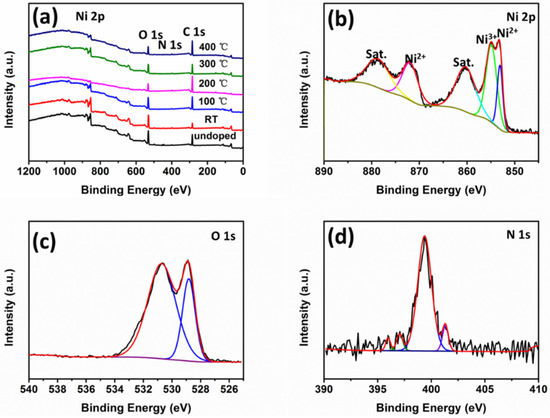 The surface elemental composition and state of NiO thin films were analyzed by XPS, as shown in Figure 6. The XPS survey spectra in Figure 6a show the peaks characteristics of nickel, oxygen, nitrogen, and carbon in all samples. The Ni 2p spectra (Figure 6b) contained six components. The peaks at 853.9 and 872.8 eV were attributed to Ni2+, and the peak at around 861.1 eV is their satellite (sat.) peak. The peak at 855.7 eV was assigned to Ni3+ [20]. A shakeup-type satellite peak of Ni 2p1/2 was detected at 879.7 eV. The O 1s spectra shown in Figure 6c contain two peaks at 529.6 and 531.4 eV, corresponding to Ni–O and Ni2O3 [21]. N 1s spectra are shown in Figure 6d. The peaks located at 396.7 and 397.8 eV were assigned to atomic N in Ni oxide lattice [22] and N atom bonded to O [23], respectively. The other two peaks at 400.2 and 402.0 eV could be attributed to nitrogen atoms related to N–O bonds due to surface oxidation and ammonium-type bonds [24,25,26].