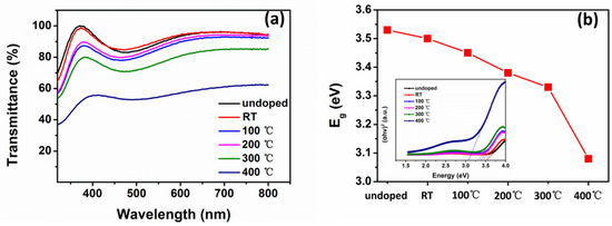 UV–Vis transmittance spectra of NiO thin films are shown in Figure 8. The effect of the ITO layer and glass on the transmittance was deducted as baseline. The transmittance of NiO thin films at room temperature reduced slightly when N was doped. For N-doped NiO, the average transmittance in the visible region reduced from 90% to 50% gradually as the temperature increased from room temperature to 400 °C. The reduced transmittance was associated with the increase of Ni3+ [27]. The optical bandgap energy (Eg) of N-doped NiO thin films at different substrate temperatures is shown in Figure 4b. It was determined from the Tauc’s plot shown in the inset. The Tauc’s plot was calculated using the Tauc’s relation below: