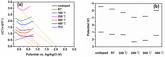 The Mott–Schottky plots were constructed as a function of the applied DC potential. The Mott–Schottky plots of all samples were obtained using an Ag/AgCl electrode in 1 M NaSO4 aqueous solution. The Mott–Schottky plots showed a V shape curve revealing a p–n junction structure of ITO layer and NiO thin film. The Mott–Schottky plot of the ITO layer in Figure 9a exhibits a positive slope, confirming an n-type conductivity. According to Figure 9a, all N-doped NiO thin films were p-type semiconductors. The flat band potential EFB is the intercept of the plot linear part with the potential axis. The EFB of undoped NiO thin films versus the Ag/AgCl electrode was 0.75 V. The EFB of N-doped NiO thin films versus the Ag/AgCl electrode was 1.06, 1.13, 2.09, 1.9, 1.2 V as the substrate temperature increased from room temperature to 100, 200, 300 and 400 °C. EVB values were calculated according to the equation [31]: