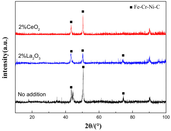 Figure 1 shows the XRD results of the cladding layer before and after the modification of different rare earth oxides. It is clearly shown that the addition of rare earth oxides did not change the phase composition of the cladding layer, which was mainly composed of an Fe–Cr–Ni–C austenite phase. This indicates that the added rare earth should be present in the form of a solid solution state in the cladding layer, since the operation temperature of the laser cladding is far beyond the melting temperature of rare earth oxides (the melting temperature of CeO2 and La2O3 is 2400 °C and 2315 °C, respectively, and the highest temperature of the spot center can reach about 2800 °C with 3000 W of laser power [21]).