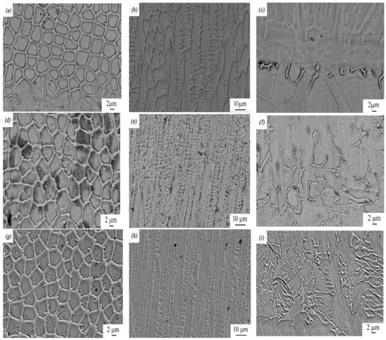 SEM micrographs of rare earth oxide-modified 316L cladding layer: (a) the top, (b) middle, and (c) bottom part of the laser-cladding layer when no rare earth was added; (d) the top, (e) middle, and (f) bottom part of the laser-cladding layer modified using 2 wt % La2O3; (g) the top, (h) middle, and (i) bottom part of the laser-cladding layer modified using 2 wt % CeO2.