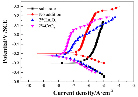 Figure 6 shows polarization curves of the 316L stainless steel before and after laser cladding with or without the modification of rare earth oxides in 3.5 wt % NaCl solution. Compared to the 316L stainless steel substrate, the corrosion potential positively shifted, and the passive current density decreased after laser cladding. The relevant parameters are shown in Table 2, which shows that laser cladding using rare earth oxide modification could significantly improve the uniform corrosion resistance of the 316L stainless steel in 3.5 wt % NaCl solution. However, the decrease in pitting potential after rare earth oxide modification suggested that 316L stainless steel modified by laser cladding has a higher probability of undergoing pit corrosion in aerated 3.5 wt % NaCl solution.