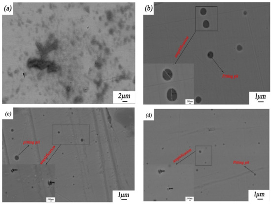 Corrosion morphologies of 316L stainless steel before and after rare earth oxide-modified laser cladding after a 96-h salt spray test: (a) 316L stainless steel substrate; (b) laser-cladded 316L stainless steel when no rare earth oxides were added; (c) laser-cladded 316L stainless steel modified using 2 wt % La2O3; and (d) laser-cladded 316L stainless steel modified using 2 wt % CeO2. The average pit sizes in Figure 9b–d are 11182, 426, and 406 nm, respectively.
