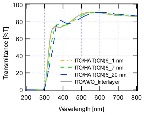 Figure 1 shows spectral transmittance characteristics with HAT(CN)6 thickness variation. The devices consisted of ITO (Indium Tin Oxide)/Interlayer X [X = HAT(CN)6 (1, 7, 20 nm)] or without Interlayer. The devices showed a similar maximum transmittance of 91.5% in the wavelength range, including the visible light region. Given that the ITO thin film is as thin as 50 nm, and the HATCN film is thin as well, the transmittance of long wavelengths of 600 nm or greater is almost at the same level as that of bare glass. Also, the ITO substrate uses an optical-grade glass, and, therefore, at long wavelengths of 600 nm or greater, the transmittance of only the ITO substrate is as high as 90% to 91%. Therefore, the HAT(CN)6 showed a generally high transmittance in the visible light region. As the thickness of the HAT(CN)6 increased, the transmittance spectrum from the thicker layers presented a bathochromic shift.