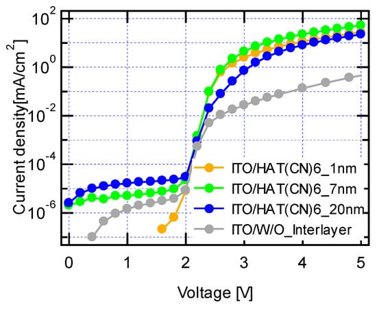 Figure 2 shows current density–voltage characteristics with log-linear scale with HAT(CN)6 thickness variation. The devices consisted of ITO/Interlayer X [X = HAT(CN)6 (1, 7, 20 nm)], or without Interlayer/α-NPD (95 nm)/Alq3:C545T (25 nm, 1%)/BPhen (25 nm)/LiF (1 nm)/Al (150 nm). The current density of the devices with ITO/Interlayer X [X = HAT(CN)6 (1, 7, 20 nm)], or without Interlayer were evaluated as 0.60720, 0.77299, 0.07841 and 0.00008 mA/cm2, respectively, at 2.6 V. The current density of the devices with ITO/Interlayer X [X = HAT(CN)6 (1, 7, 20 nm)], or without Interlayer were evaluated as 23.37750, 45.04625, 18.92525 and 0.00301 mA/cm2, respectively, at 4.8 V. At a driving voltage of 2.6 V, the device with 7 nm HAT(CN)6 achieved a current density 9.86-times higher than that with 20 nm HAT(CN)6. The current density of the device with 7 nm HAT(CN)6 was 9574-times higher than that without an interlayer. At a driving voltage of 4.8 V, the device with 7 nm HAT(CN)6 achieved a current density 2.38-times higher than that with 20 nm HAT(CN)6. The current density of the device with 7 nm HAT(CN)6 was 14,954-times higher than that without an interlayer. The current increase (2.38 times) of the device with 7 nm HAT(CN)6 relative to that with 20 nm HAT(CN)6 at a high driving voltage of 4.8 V was significantly lower than the current increase (9.86 times) of the device with 7 nm HAT(CN)6 at a low driving voltage of 2.6 V.
