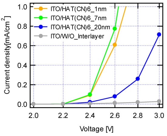 Figure 3 shows a low driving voltage range of the current density–voltage characteristics with linear–linear scale with HAT(CN)6 thickness variation. The current density of the devices with ITO/ Interlayer X [X = HAT(CN)6 (1, 7, 20 nm)], or without Interlayer were evaluated as 0.00137, 0.00145, 0.00089 and 0.00002 mA/cm2, respectively, at 2.2 V. The work functions of ITO/Interlayer X [X = HAT(CN)6 (1, 7, 20 nm)], or without Interlayer were estimated to be 5.1, 5.4, 5.65 and 4.7 eV, respectively [,]. The work function of α-NPD was estimated to be 5.4 eV []. As shown in Figure 2, 7 nm HAT(CN)6, used as the interlayer, and α-NPD showed very steep initial current density increases, as there was no injection barrier. The 1 nm HAT(CN)6 device exhibited slightly lower current density characteristics than the 7 nm HAT(CN)6 device, due to the presence of an injection barrier of 0.3 eV. Since the gap between the HOMO (Highest Occupied Molecular Orbital) level of α-NPD and the LUMO level of HAT(CN)6 is under 0.5 eV, the carrier transport between the two materials is easy. The carrier ladder effect and carrier transport mechanism resulting from the introduction of HAT(CN)6 led to excellent current density characteristics [,].