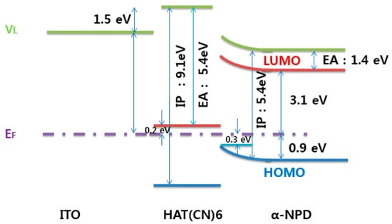 The carrier transport between HAT(CN)6 and α-NPD is described in Figure 4 [,]. The Fermi level is contiguous to the conduction band for HAT(CN)6. The Fermi level is contiguous to the HOMO level for α-NPD. Specifically, the HOMO level for α-NPD is about 1.1 eV away from the conduction band of HAT(CN)6. In this regard, the carrier-transport process from the HOMO level for α-NPD to the conduction band of HAT(CN)6 is deemed easy. Simply put, the device with 20 nm HAT(CN)6, which has bulk characteristics, allows for easier carrier transport, and this is why the device exhibited an improvement in current density under the high driving voltage condition, compared to the devices equipped with 1 and 7 nm thin-film HAT(CN)6. In contrast, the device without an interlayer showed the worst current density characteristics, due to the hole injection barrier. HAT(CN)6 has a work function that varies with thickness and thus can be used as an excellent interlayer matching a hole transport layer.