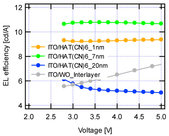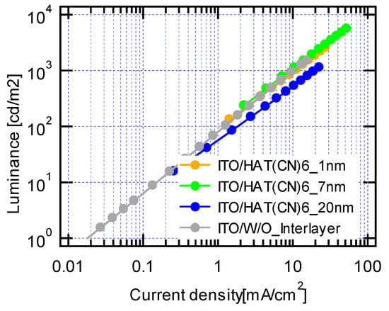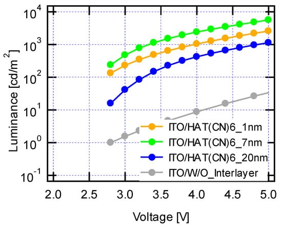 Figure 5 shows luminance–voltage characteristics with log-linear scale with HAT(CN)6 thickness variation. As shown in Figure 5, the driving voltage starts from 2.8 V. This is because a luminance measurement system is divided into a current–voltage system and a current–voltage–luminance system, and is, therefore, forcibly converted to the current–voltage–luminance system from 2.8 V. The devices showed luminance–voltage characteristics similar to the current density–voltage characteristics. The device using 7 nm HAT(CN)6 showed the best luminance characteristics. On the other hand, the device without an interlayer showed the worst luminance characteristics.