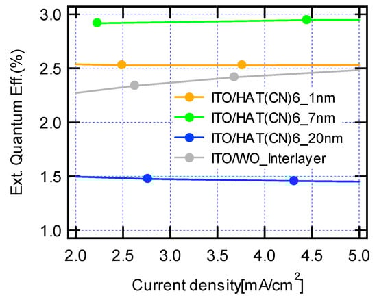 Figure 8 shows external quantum efficiency–current density characteristics with linear–linear scale with HAT(CN)6 thickness variation. Among the devices used, the device using 7 nm HAT(CN)6 as the interlayer achieved an external quantum efficiency of 2.96%. It achieved good external quantum efficiency, due to the proper carrier balance of holes and electrons.