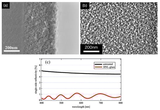 Figure 1. The HNL characterization. (a) Cross-sectional view and (b) surface view of the HNL in SEM micrography. Both micrographs were obtained without any metal deposition. (c) Single-side reflectivity spectrum of HNL and untreated glass.