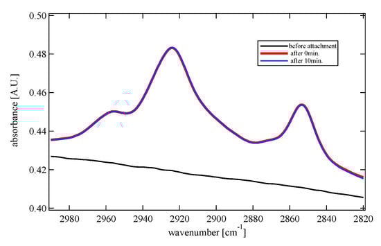 The alkyl-originated absorption just after the fingerprint attachment and 10 min later were compared in the figure. What is to be noted here is that the absorption peaks remained unchanged during the fingerprint blurring that was observed in Figure 2. This means there was neither decomposition [19] nor removal of the organic component in the fingerprint during the blurring. Therefore, the cause of the fingerprint blurring on HNL is indicated to be some transportation of the attached materials.