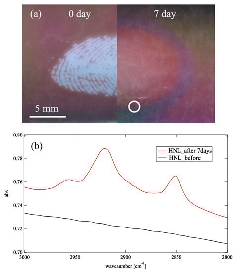 The fingerprint blurring persisted for a long time to form a large ring around the initial fingerprint after a week (Figure 4a). Figure 4b shows IR absorption spectra measured around the initial fingerprint before and after the spreading. As shown in the figure, the spread material contained the fatty acid alkyl group, which was also in the initial fingerprint (Figure 3). In other words, the fingerprint blurring progresses with the transportation of the fatty acid in the HNL as in chocolate [20].