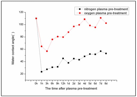 The contact angle of the treated specimens was determined using a contact angle meter (HARKE-SPCA-1, Beijing, China), in order to evaluate the wettability of the specimen surfaces. Four points were measured for each group and the average value was then calculated. The static sessile drop method used distilled water as test liquid and a drop size of 3 µL. The test interval time was selected for 1 h, 3 h, 6 h, 9 h, 12 h, 1 d, 2 d, 3 d, 4 d, 5 d, 6 d, 7 d, and 8 d to record the time. Additionally, the gases used as plasma atmosphere were nitrogen and oxygen (Fuzhou Huaxinda Industrial Gas Co., Ltd., Fuzhou, China), and their purity was 99.99%. The plasma treatment device was the OSKUN-PR60L Plasma processor (Shenzhen OKSUN technology Co., Ltd. Shenzhen, China). The plasma treatment power was 100 W, the treatment time was 30 s, and the gas pressure was 40 Pa.