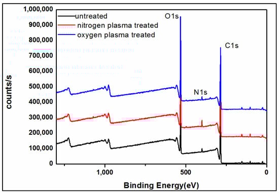 XPS was used to reveal the surface changes in chemical elements and functional groups after plasma treatment. Figure 2 is an XPS full spectrum of untreated, nitrogen plasma-treated, and oxygen plasma-treated wood. Figure 3 presents a general survey of the surface chemical compositions of plasma-treated wood.