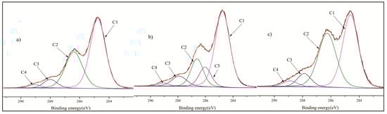 The C1 peak represents C–C and C–H bonds, which mainly exist in lignin and extractives; the C2 peak is assigned to C–O, which is mainly found in hydroxyl and other groups of lignin and polysaccharides; the C3 peak corresponds to O–C–O or C=O, which is found in cellulose, hemicelluloses and lignin; and the C4 peak is assigned to O=C–O, and is present in hemicelluloses [25].