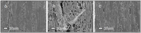 Scanning Electron Microscopy (SEM) images of thermo-treated cherry wood: (a) untreated, (b) nitrogen plasma treated, and (c) oxygen plasma treated.