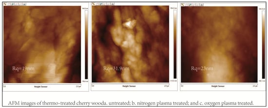 In Figure 5, atomic force microscopic (AFM) images of untreated and plasma-treated specimens revealed differences in the surface topography, demonstrating the same result as that obtained with SEM. AFM images of the untreated cherry wood surface seem to exhibit particles, which can be assigned to amorphous hemicelluloses and extractives in the wood surface. The surface roughness increased after the plasma treatment, which is reflected in the figure of Rq (root mean square deviation). Additionally, evidently, the surface treated by nitrogen plasma looks rougher in the images, which may be associated with the second cell wall. The second cell wall is etched or degraded, leading to the exposure of the S2 layer [28]. The rougher surface is beneficial for bonding, because it can provide better interface bonding between the wood surface and the adhesive.