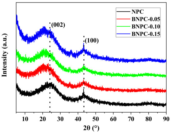The crystalline structure of the NPC and BNPC-X were determined by XRD, and the results are displayed in Figure 1. It is found that all the samples exhibit two broad and low-intensive diffraction peaks centered at 2θ = 20°–26° and 43°–44°, which can be attributed to the (002) and (100) diffractions of the hexagonal graphitic carbon lattice, clearly indicating an amorphous nature and low graphitization degree of the nanoporous carbon materials [27,28]. The BNPC-X exhibit a gradual left shift of (002) and (100) peaks with the increase of the boron acid mass ratio, indicating a slight damage of the micro-graphitic structure of carbon materials [29,30]. Moreover, the intensity of the diffraction peak of BNPC-0.15 at a low angle is significant, showing the existence of abundant pores.