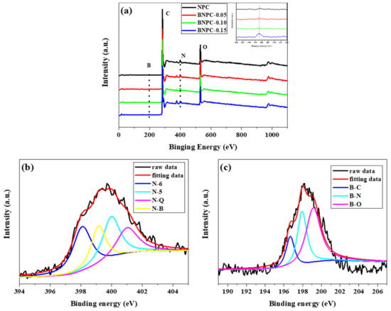The surface electronic state and composition of the NPC and BNPC-X were analyzed by X-ray photoelectron spectroscopy (XPS) and elemental analysis. Figure 3 exhibits the wide-scan XPS spectrum of all the samples and the fitted N1s and B1s XPS spectra of BNPC-0.15. As shown in Figure 3a, the NPC contains C, N, and O elements. Moreover, the BNPCs contain C, N, B and O atoms, indicating that boron can be successfully introduced into the carbon framework. As the initial weight ratio of boron acid to benzoxazine resin increased from 0.05 to 0.15, the nitrogen content of BNPC-X decreased, and the boron element content increased gradually (Table 1). Three different types of nitrogen species can be distinguished on the N 1s spectrum: pyridinic nitrogen (N-6 at 398.5 eV), pyrrolic or pyridonic nitrogen (N-5 at 400.3 eV), and quaternary nitrogen (N-Q at 401.4 eV), respectively [28]. However, it can be found that the peak at 396.6 eV could be assigned to the B 1s signal related to N–B bonding, which is characteristic for boron nitride. The B 1s XPS spectrum is deconvoluted into three peaks (Figure 3c). The peaks located at 398.5, 399.6, and 401.2 eV can be assigned to B–N, B–C, and B–O species, respectively, demonstrating that the boron atoms are incorporated into the carbon network [33]. The nitrogen and boron-containing groups cannot only enhance the specific capacitance but can also improve the surface wettability at the electrode/electrolyte interface. The element composition of the NPC and BNPC-X is seen in Table 1. The element percentage of boron in NPC, BNPC-0.05, BNPC-0.10, and BNPC-0.15 is calculated from the XPS survey spectra to be about 0, 1.02, 1.88 and 2.75 wt %, respectively, which is consistent with the elemental analysis results. Thereby, the XPS results prove that the boron and nitrogen atoms were successfully incorporated in the carbon lattice, which can generate primary pseudo-capacitance in an alkaline aqueous electrolyte.