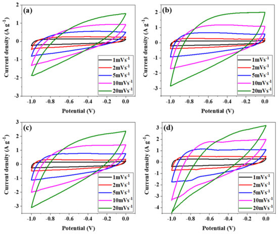 Cyclic voltammetry (CV) was used to probe the electrochemical capacitive behavior of the NPC and BNPC-X electrodes in a potential window from −1.0 to 0 V·vs·SCE in the 6 M·KOH electrolyte. Figure 4 shows the CV curves of the NPC and BNPC-X electrodes at different scanning rates from 1 to 20 mV·s−1. As shown in Figure 4a, the CV curve of the NPC electrode shows a small deviation from the rectangular shape, with no obvious redox peaks. It can be discerned that the BNPC-X electrodes exhibit an ambiguous rectangular shape with a pair of obvious peaks, which may be caused by some pseudocapacitive effects with the increased the mass ratio of boron acid (Figure 4b–d). As the scanning rate increases, the rectangular shape becomes more distorted and the enclosed area decreases. This is due to the internal resistance of the current collector, electrode, and electrolyte, or the diffusion resistance at the electrode/electrolyte interface [34]. In particular, it can be noted that BNPC-0.15 can reach the largest specific capacitance among all the electrodes, and this may be attributed to the electrical double layer capacitance due to its own porous structure and additional pseudocapacitance resulting from the boron doping in the carbon electrodes (Figure 4d).