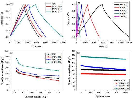 Galvanostatic charge–discharge (GCD) curves of the NPC and BNPC-X at a current density of 0.05 A·g−1 (a), GCD curves of the BNPC-0.15 at different current densities (b), the specific capacitances of the NPC and BNPC-X at different current densities (c), and the cycling stability of the NPC and BNPC-X at a current density of 1 A·g−1 (d).