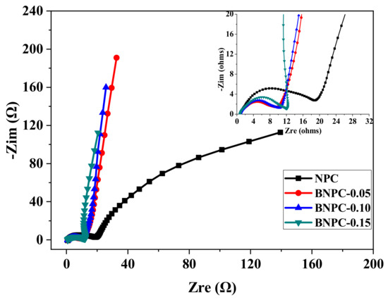 Electrochemical impedance spectra (EIS) are further used to analyze the electrochemical performance of the electrode materials for supercapacitors. Figure 6 exhibits the AC impedance spectroscopy (Nyquist plots) of all the NPC and BNPC-X electrodes with an open circuit. Obviously, all the curves present a similar shape, which contain a semicircle at high frequency, a nearly 45° sloped line at medium frequency and a nearly vertical line at low frequency. The straight line in the low-frequency area presents the specific capacitance of the carbon electrode [36]. It can be found that the BNPC-0.15 electrode exhibits the shortest line length in the low-frequency area, suggesting the highest specific capacitance. The semicircle presents the interfacial charge transfer resistance of the carbon electrode in the high-frequency region [37]. The smaller the diameter, the lower the interfacial charge transfer resistance. The BNPC-0.15 electrode exhibits low charge transfer resistance and Warburg impedance in the high-frequency area, implying the fastest ion migration. This is not only due to the suitable pore structure of the carbon materials promoting the ion diffusion and transport, but is also because of the enhanced surface wettability after boron and nitrogen doping.