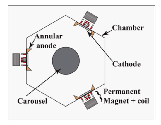 A magnetic system consisted of a combination of three permanent magnet rings, and an additional electromagnetic coil (Figure 1) was used to steer cathode spots. It was placed behind each of the arc sources and outside the grounded vacuum chamber. The strength of the generated magnetic field was varied by applying DC coil currents between 0–2 A, resulting in different magnetic field configurations. The magnetic field at the cathode surface was simulated by using a finite element software (FEMM version 4.2). The validity of the simulated magnetic flux density was confirmed by measuring the magnetic flux density along a straight line from the cathode center to the periphery with a gaussmeter (Lake Shore 421, Westerville, OH, USA) using a flat Hall probe.