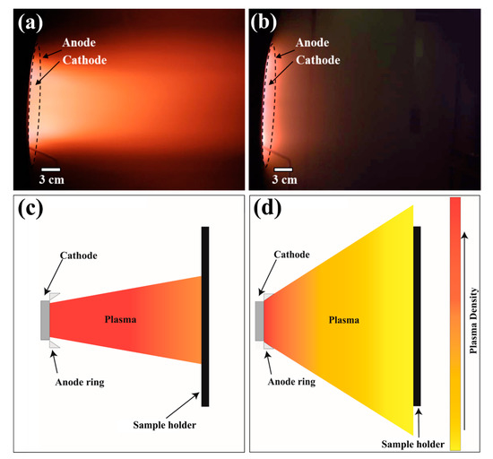 Figure 3 depicts cross-sectional images of the plasma plume, for a coil current of 0 A is shown in Figure 3a, and for 2 A, it is shown in Figure 3b. A change in coil current from 0 to 2 A results in a reduction of the plasma density. The side view of the plasma plume emanating from the cathode is schematically portrayed for 0 (Figure 3c) and 2 A (Figure 3d) coil currents. The schemes are intended to show the spread of the plasma in a radial fashion toward the cathode edges that takes place as the cathode spots are steered to the cathode surface periphery (Figure 3c,d) with increasing coil current. The changes in plasma density when changing the coil current is represented by the pseudocolor in Figure 3c,d.