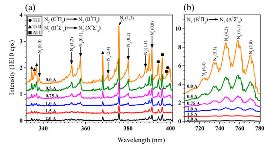 Figure 5a shows OES results of the plasma for the wavelengths 332–401 and 565–780 nm at different coil currents (0 to 2 A). The emission lines observed are from neutral and singly ionized titanium (Ti I, Ti II), neutral aluminum (Al I), the first (B3Πg → A3Σ+u) and second (C3Πu → B3Πg) positive systems of neutral molecular nitrogen (N2), and the first negative system (B2Σ+u → X2Σ+g) from singly ionized molecular nitrogen (N2+). In addition, singly ionized Al (Al II, 466.30 nm) [31], doubly ionized Ti (Ti III, 467.33 and 519.34 nm) [33], and doubly ionized Al (Al III, 447.99 and 451.25 nm) [39] were also observed. The line intensities of all the observed species decrease with increasing coil current. Such a decrease is particularly evident for the molecular nitrogen bands shown in Figure 5b. It is well known that cathodic arc plasma contains multiply charged species [40]. Al IV, Ti IV, and Ti V lines that exist in the 10 to 300 nm wavelength range [41,42,43,44] are not observed here due to the absorption of wavelengths below about 330 nm by the viewport glass of the chamber. Additionally, Ti IV lines between 748–770 nm are overlapped by N2 lines and have weak intensities.