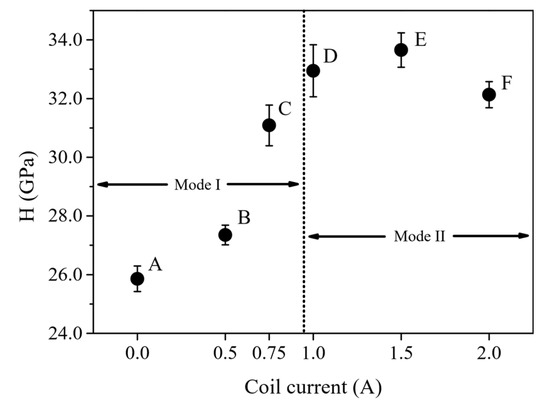 Hardness of coating as a function of coil current. Letters (A–F) indicate sample labeling (see Table 1).