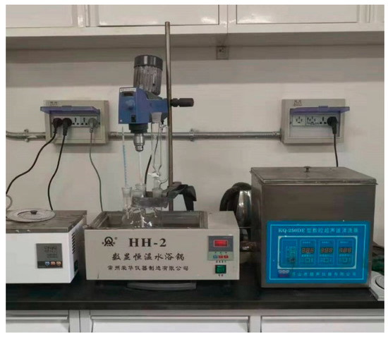 Amorphous nano-SiO2·0.5H2O particles were prepared by the chemical precipitation method. Briefly, The CaSiO3 slurry (4 wt.% in water) was prepared by mixing wollastonite and SDBS (wollastonite:SDBS = 100:2, m/m) into DI water in a 1000 mL four-port reactor (see Figure 1) at 85 °C by means of a thermostatic water bath. Under stirring, H2SO4 (0.34 mol/kg) was dropwise added into the slurry. Here, the molar ratio of H2SO4 to CaSiO3 (n(H2SO4):n(CaSiO3)) is 2:1. The solution was kept stirring until no sedimentation existed. After aging, the by-product CaSO4 was filtered and the remaining H2SiO3 collosol was kept stirred (700 rpm) at 85 °C. Then NaOH was introduced to adjust the pH of the collosol. The reaction was kept 30 min under stirring when the pH value of the collosol was 8. The conditions were hereafter referred as the standard set. After that, the amorphous nano-SiO2·0.5H2O particles were collected, treated through washing with DI water and vacuum filtration, and finally dried at 70 °C. The vacuum filtration was performed by an SHZ-D(III) circulating water vacuum pump with a negative pressure of 0.1 MPa, and filter papers with pore size of ~1 μm were utilized.