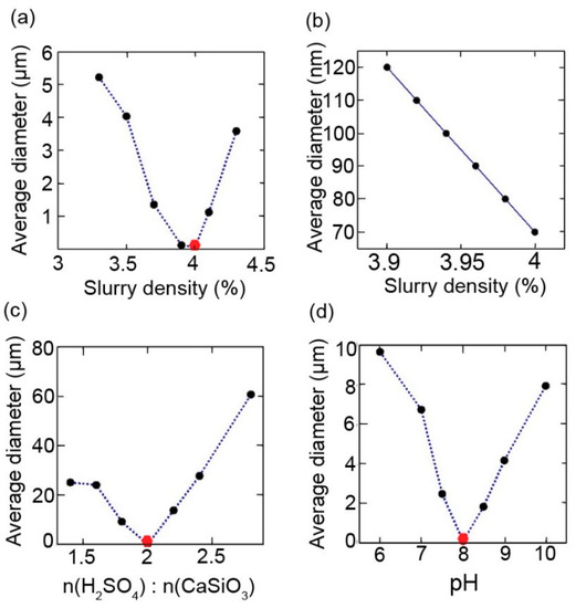 (a,b): The average diameter of nanoparticles with different concentrations of CaCO3 slurry with other reagents held at the standard conditions. (c) The average diameter of nanoparticles with a different molar ratio of H2SO4 to CaSiO3 with other reagents held at the standard conditions. (d) The average diameter of nanoparticles with different pH value with other reagents held at the standard conditions. The red hexagon indicated the average diameter of nanoparticles synthesized at the standard conditions. The average diameter at this point is 70 nm.